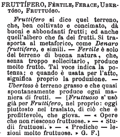 | Fruttifero, Fertile, Ferace, Ubertoso, Fruttuoso - Fruttifero si dice quel terreno, che, ben coltivato e concimato, dà buoni e abbondanti frutti; ed anche quell'albero che fa dei frutti. Si trasporta al metaforico, come Denaro fruttifero, e simili. - Fertile è solo del terreno di buona natura, che, senza troppo sollecitarlo, produce molto frutto. Tal voce indica la potenza; e quando è usata per l'atto, significa proprio la produzione. - Ubertoso è terreno grasso e che quasi spontaneamente produce ogni maniera di frutti. - [Fruttuoso s'usò già per Fruttifero, nel proprio: oggi piuttosto nel traslato, di ciò che è profittevole, che giova. - «Opere che non riescono fruttuose.» - «Studii fruttuosi.» - «Prediche - lezioni molto fruttuose.» G. F.] [immagine] |
