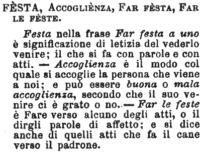 | Festa, Accoglienza, Far festa, Far le feste - Festa nella frase Far festa a uno è significazione di letizia del vederlo venire; il che si fa con parole e con atti. - Accoglienza è il modo col quale si accoglie la persona che viene a noi; e può essere buona o mala accoglienza, secondo che il suo venire ci è grato o no. - Far le feste è Fare verso alcuno degli atti, o il dirgli parole di affetto; e si dice anche di quelli atti che fa il cane verso il padrone. [immagine] |