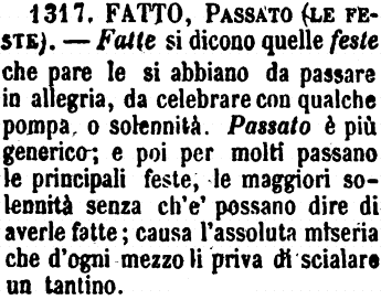 | Fatto, Passato (le feste) - Fatte si dicono quelle feste che pare le si abbiano da passare in allegria, da celebrare con qualche pompa, o solennità. Passato è più generico; e poi per molti passano le principali feste, le maggiori solennità senza ch'e' possano dire di averle fatte; causa l'assoluta miseria che d'ogni mezzo li priva di scialare un tantino. [immagine] |