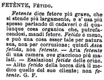 | Fetente, Fetido - Fetente dice fetore più grave, che si stende più largamente, e s'usa più spesso parlando di cadaveri o di qualunque cosa organica che, putrefacendosi, mandi fetore. Fetido è meno, e può una cosa esser tale per natura sua, non per corruzione; quindi Assa fetida, non fetente. - Aria fetente di una camera ove giacciono più malati. - Esalazioni fetide delle orine. - Alito fetido della bocca dirà il medico quello del suo cliente; non fetente. G.F. [immagine] |