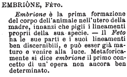 | Embrione, Feto - Embrione è la prima formazione del corpo dell'animale nell'utero della madre, innanzi che pigli i lineamenti proprii della sua specie. - Il Feto ha le sue parti e i suoi lineamenti ben discernibili, e può esser già maturo e venire alla luce. Metaforicamente si dice embrione il primo concetto di un'opera non ancora ben determinato. [immagine] |