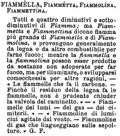 | Fiammella, Fiammetta, Fiammolina, Fiammettina - Tutti e quattro diminutivi e sottodiminutivi di Fiamma; ma Fiammetta e Fiammettina dicono fiamma più grande di Fiammella e di Fiammolina, e provengono generalmente da legna o da altro combustibile per farne fuoco; mentre la fiammella e la fiammolina posson esser prodotte da sostanze non adoperate per far fuoco, ma per illuminare, o svilupparsi comecchessia per altre ragioni. - «Le fiammelle che fa il carbone. – Finchè il residuo della legna fa le fiammelle, non è prudente chiuder la valvola del caminetto.» - «Fiammelle dei lumi – del gas – dei cimiterii.» - «Fiammoline di lumicini agitate dal vento. – Fiammoline di gas che lingueggiano sulle sepolture.» G.F. [immagine] |