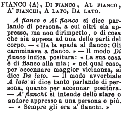 | Fianco (a), Di fianco, Al fianco, A’ fianchi, A lato, Da lato - A fianco e Al fianco si dice parlando di persona, a cui altri sia appresso, ma non dirimpetto, o di cosa che sia appesa ad una delle parti del corpo. - «Ha la spada al fianco; Gli camminava a fianco.» - Il modo Di fianco indica positura: « La sua casa è di fianco alla mia;» nel qual caso, per accennare maggior vicinanza, si dice Da lato. - Il modo avverbiale A lato si dice tanto parlando di persona, quanto per accennar positura. - A' fianchi si intende dello stare o andare appresso a una persona o più. - « Sempre gli era a' fianchi.» [immagine] |