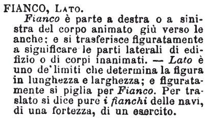 | Fianco, Lato - Fianco è parte a destra o a sinistra del corpo animato giù verso le anche; e si trasferisce figuratamente a significare le parti laterali di edifizio o di corpi inanimati. - Lato è uno de' limiti che determina la figura in lunghezza e larghezza; e figuratamente si piglia per Fianco. Per traslato si dice pure i fianchi delle navi, di una fortezza, di un esercito. [immagine] |