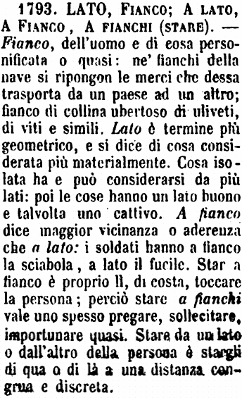 | Lato, Fianco; A lato, A fianco, A fianchi (stare) - Fianco, dell'uomo e di cosa personificata o quasi: ne' fianchi della nave si ripongon le merci che dessa trasporta da un paese ad un altro; fianco di collina ubertoso di utiliveti, di viti e simili. Lato è termine più geometrico, e si dice di cosa considerata più materialmente. Cosa isolata ha e può considerarsi da più lati: poi le cose hanno un lato buono e talvolta uno cattivo. A fianco dice maggior vicinanza o aderenza che a lato: i soldati hanno a fianco la sciabola, a lato il fucile. Star a fianco è proprio lì, di costa, toccare la persona; perciò stare a fianchi vale uno spesso pregare, sollecitare, importunare quasi. Stare da un lato o dall'altro della persona è stargli di qua o di là a una distanza congrua e discreta. [immagine] |