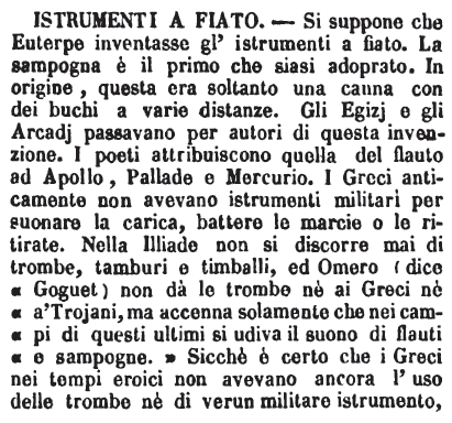 | Istrumenti a fiato - Si suppone che Euterpe inventasse gl'istrumenti a fiato. La sampogna è il primo che siasi adoprato. In origine, questa era soltanto una canna con dei buchi a varie distanze. Gli Egizj e gli Arcadj passavano per autori di questa invenzione. I poeti attribuiscono quella del flauto ad Apollo, Pallade e Mercurio. I Greci anticamente non avevano istrumenti militari per suonare la carica, battere le marcie o le ritirate. Nella Illiade non si discorre mai di trombe, tamburi e timballi, ed Omero (dice «Goguet) non dà le trombe nè ai Greci nè a' Trojani, ma accenna solamente che nei campi di questi ultimi si udiva il suono di flauti e sampogne.» Sicchè è certo che i Greci nei tempi eroici non avevano ancora l'uso delle trombe nè di verun militare istrumento, [immagine] |
