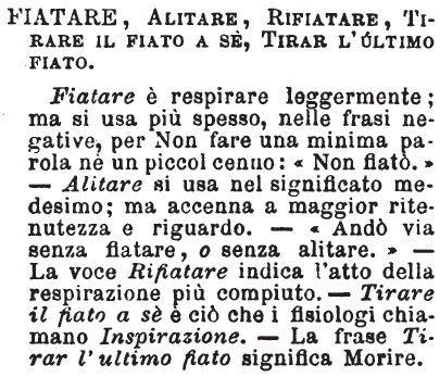 | Fiatare, Alitare, Rifiatare, Tirare il fiato a sè, Tirar l’ultimo fiato - Fiatare è respirare leggermente; ma si usa più spesso, nelle frasi negative, per Non fare una minima parola nè un piccol cenno: «Non fiatò.» - Alitare si usa nel significato medesimo; ma accenna a maggior ritenutezza e riguardo. - «Andò via senza fiatare, o senza alitare.» - La voce Rifiatare indica l'atto della respirazione più compiuto. - Tirare il fiato a sè è ciò che i fisiologi chiamano Inspirazione. - La frase Tirar l'ultimo fiato signfica Morire. [immagine] |