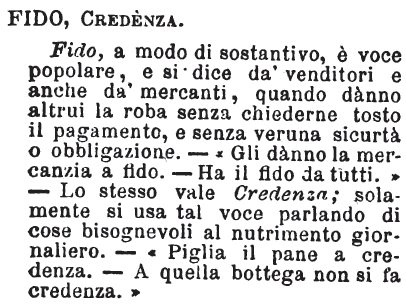 | Fido, Credenza - Fido, a modo di sostantivo, è voce popolare, e si dice da' venditori e anche da' mercanti, quando dànno altrui la roba senza chiederne tosto il pagamento, e senza veruna sicurtà o obbligazione. - «Gli dànno la mercanzia a fido. - Ha il fido da tutti.» - Lo stesso vale Credenza; solamente si usa tal voce parlando di cose bisognevoli al nutrimento giornaliero. - «Piglia il pane a credenza. - A quella bottega non si fa credenza.» [immagine] |