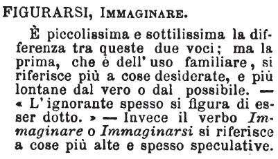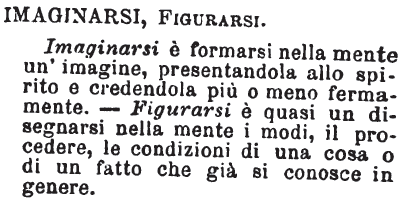 | Imaginarsi, Figurarsi - Imaginarsi è formarsi nella mente un'imagine, presentandola allo spirito e credendola più o meno fermamente. - Figurarsi è quasi un disegnarsi nella mente i modi, il procedere, le condizioni di una cosa o di un fatto che già si conosce in genere. [immagine] |