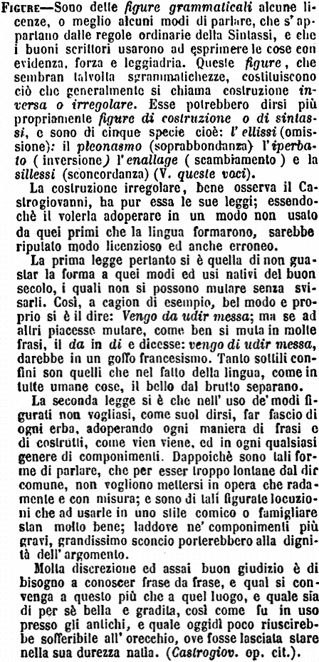 | Figure - Sono dette figure grammaticali alcune licenze, o meglio alcuni modi di parlare, che s'appartano dalle regole ordinarie della Sintassi, e che i buoni scrittori usarono ad esprimere le cose con evidenza, forza e leggiadria. Queste figure, che sembran talvolta sgrammatichezze, costituiscono ciò che generalmente si chiama costruzione inversa o irregolare. Esse potrebbero dirsi più propriamente figure di costruzione o di sintassi, e sono di cinque specie cioè: l'ellissi (omissione): il pleonasmo (soprabbondanza) l'iperbato (inversione) l'enallage (scambiamento) e la sillessi (sconcordanza) (V. queste voci).