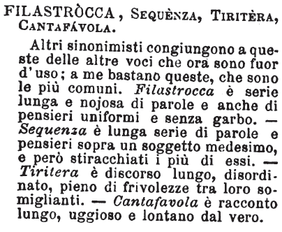 | Filastrocca, Sequenza, Tiritera, Cantafavola - Altri sinonimisti congiungono a queste delle altre voci che ora sono fuor d'uso; a me bastano queste, che sono le più comuni. Filastrocca è serie lunga e nojosa di parole e anche di pensieri uniformi e senza garbo. - Sequenza è lunga serie di parole e pensieri sopra un soggetto medesimo, e però stiracchiati i più di essi. - Tiritera è discorso lungo, disordinato, pieno di frivolezze tra loro somiglianti. - Cantafavola è racconto lungo, uggioso e lontano dal vero. [immagine] |
