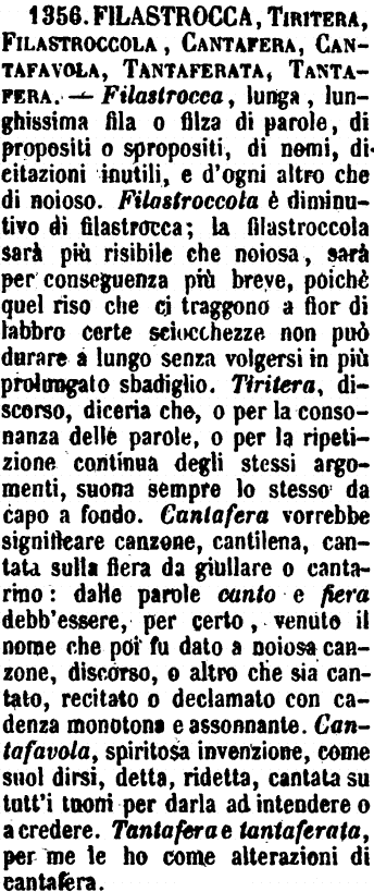 | Filastrocca, Tiritera, Filastroccola, Cantafera, Cantafavola, Tantaferata, Tantafera - Filastrocca, lunga, lunghissima fila o filza di parole, di propositi o spropositi, di nomi, di citazioni inutili, e d'ogni altro che di noioso. Filastroccola è diminutivo di filastrocca; la filastroccola sarà più risibile che noiosa, sarà per conseguenza più breve, poichè quel riso che ci traggono a fior di labbro certe sciocchezze non può durare a lungo senza volgersi in più prolungato sbadiglio. Tiritera, discorso, diceria che, o per la consonanza delle parole, o per la ripetizione continua degli stessi argomenti, suona sempre lo stesso da capo a fondo. Cantafera vorrebbe significare canzone, cantilena, cantata sulla fiera da giullare o cantarino: dalle parole canto e fiera debb'essere, per certo, venuto il nome che poi fu dato a noiosa canzone, discorso, o altro che sia cantato, recitato o declamato con cadenza monotona e assonnante. Cantafavola, spiritosa invenzione, come suol dirsi, detta, ridetta, cantata su tutt'i tuoni per darla ad intendere o a credere. Tantafera e tantaferata, per me le ho come alterazioni di cantafera. [immagine] |