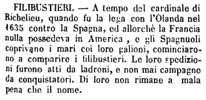 | Filibustieri - A tempo del cardinale di Richelieu, quando fu la lega con l'Olanda nel 1635 contro la Spagna, ed allorchè la Francia nulla possedeva in America, e gli Spagnuoli coprivano i mari coi loro galioni, cominciarono a comparire i filibustieri. Le loro spedizioni furono atti da ladroni, e non mai campagne da conquistatori. Di loro non rimane a mala pena che il nome. [immagine] |