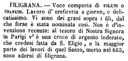 | Filigrana - Voce composta di filum e granum. Lavoro d'oreficeria a giorno, e delicatissimo. Vi sono dei grani sopra i fili, dal che è forse stata nominata così. Non è d'invenzione recente: al tesoro di Nostra Signora di Parigi v'è una croce d'argento indorato, che credesi fatta da S. Eligio, e la maggior parte dei lavori di quel Santo, morto nel 665, sono adorni di filigrana. [immagine] |