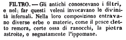 | Filtro - Gli antichi conoscevano i filtri, e nel far questi veleni invocavano le divinità infernali. Nella loro composizione entravano diverse erbe o materie, come il pesce detto remora, certe ossa di ranocchi, la pietra astroite, e segnatamente l'ippomane. [immagine] |