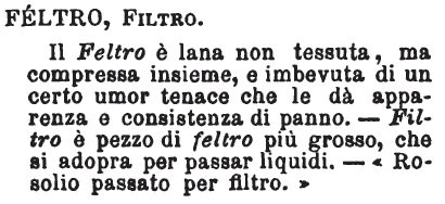 | Feltro, Filtro - Il Feltro è lana non tessuta, ma compressa insieme, e imbevuta di un certo umor tenace che le dà apparenza e consistenza di panno. - Filtro è pezzo di feltro più grosso, che si adopra per passar liquidi. - «Rosolio passato per filtro.» [immagine] |
