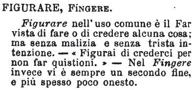 | Figurare, Fingere - Figurare nell'uso comune è il Far vista di fare o di credere alcuna cosa; ma senza malizia e senza trista intenzione. - « Figurai di crederci per non far quistioni.» - Nel Fingere invece vi è sempre un secondo fine, e più spesso poco onesto. [immagine] |
