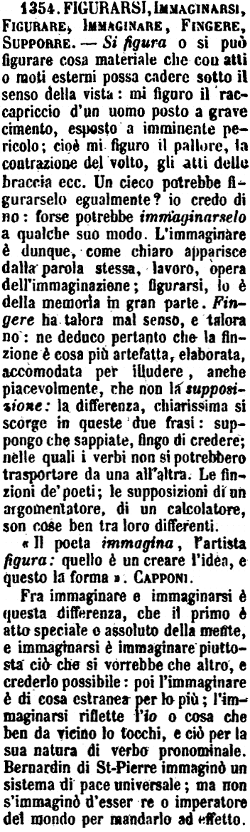 | Figurarsi, Immaginarsi, Figurare, Immaginare, Fingere, Supporre - Si figura o si può figurare cosa materiale che con atti o moti esterni possa cadere sotto il senso della vista: mi figuro il raccapriccio d'un uomo posto a grave cimento, esposto a imminente pericolo; cioè mi figuro il pallore, la contrazione del volto, gli atti delle braccia ecc. Un cieco potrebbe figurarselo egualmente? io credo di no: forse potrebbe immaginarselo a qualche suo modo. L'immaginare è dunque, come chiaro apparisce dalla parola stessa, lavoro, opera dell'immaginazione; figurarsi, lo è della memoria in gran parte. Fingere ha talora mal senso, e talora no: ne deduco pertanto che la finzione è cosa più artefatta, elaborata, accomodata per illudere, anche piacevolmente, che non la supposizione: la differenza, chiarissima si scorge in queste due frasi: suppongo che sappiate, fingo di credere; nelle quali i verbi non si potrebbero trasportare da una all'altra. Le finzioni de' poeti; le supposizioni di un argomentatore, di un calcolatore, son cose ben tra loro differenti.