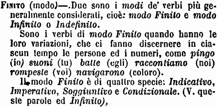 | Finito (modo) - Due sono i modi de' verbi più generalmente considerati, cioè: modo Finito e modo Infinito o Indefinito.