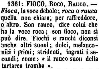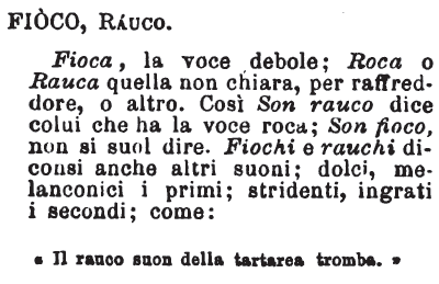| Fioco, Rauco - Fioca, la voce debole; Roca o Rauca quella non chiara, per raffreddore, o altro. Così Son rauco dice colui che ha la voce roca; Son fioco, non si suol dire. Fiochi e rauchi diconsi anche altri suoni; dolci, melanconici i primi, stridenti, ingrati i secondi; come:
