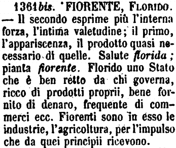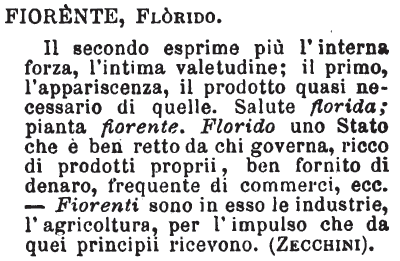 | Fiorente, Florido - Il secondo esprime più l'interna forza, l'intima valetudine; il primo, l'appariscenza, il prodotto quasi necessario di quelle. Salute florida; pianta fiorente. Florido uno Stato che è ben retto da chi governa, ricco di prodotti proprii, bene fornito di denaro, frequente di commerci ecc. Fiorenti sono in esso le industrie, l'agricoltura, per l'impulso che da quei principii ricevono. [immagine] |