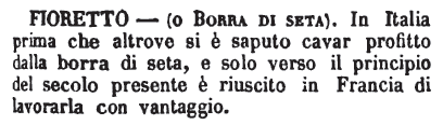 | Fioretto (o Borra di seta) - In Italia prima che altrove si è saputo cavar profitto dalla borra di seta, e solo verso il principio del secolo presente è riuscito in Francia di lavorarla con vantaggio. [immagine] |