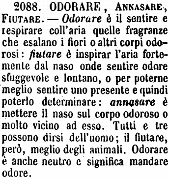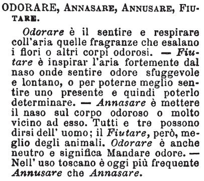 | Odorare, Annasare, Annusare, Fiutare - Odorare è il sentire e respirare coll'aria quelle fragranze che esalano i fiori o altri corpi odorosi. - Fiutare è inspirar l'aria fortemente dal naso onde sentire odore sfuggevole e lontano, o per poterne meglio sentire uno presente e quindi poterlo determinare. - Annasare è mettere il naso sul corpo odoroso o molto vicino ad esso. Tutti e tre possono dirsi dell'uomo; il Fiutare, però, meglio degli animali. Odorare è anche neutro e significa Mandare odore. - Nell'uso toscano è oggi più frequente Annusare che Annasare. [immagine] |