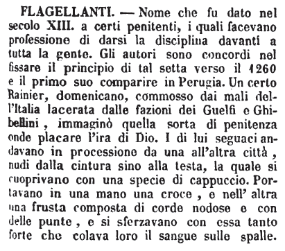 | Flagellanti - Nome che fu dato nel secolo XIII. a certi penitenti, i quali facevano professione di darsi la disciplina davanti a tutta la gente. Gli autori sono concordi nel fissare il principio di tal setta verso il 1260 e il primo suo comparire in Perugia. Un certo Rainier, domenicano, commosso dai mali dell'Italia lacerata dalle fazioni dei Guelfi e Ghibellini, immaginò quella sorta di penitanza onde placare l'ira di Dio. I di lui seguaci andavano in processione da una all'altra città, nudi dalla cintura sino alla testa, la quale si cuoprivano con una specie di cappuccio. Portavano in una mano una croce, e nell'altra una frusta composta di corde nodose e con delle punte, e si sferzavano con essa tanto forte che colava loro il sangue sulle spalle. [immagine] |