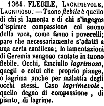 | Flebile, Lagrimevole, Lagrimoso - Tuono flebile è quello di chi si lamenta e di chi s'ingegna d'ispirare compassione col suono della voce, come fanno i poverelli; pare che necessariamente s'adatti a una certa cantilena; le lamentazioni di Geremia vengono cantate in tuono flebile. Occhi, fanciullo lagrimoso, quegli o colui che proprio piange, o lagrima anche per malattia degli occhi stessi. Caso lagrimevole, quello degno di compassione, di pianto, di lagrime. [immagine] |