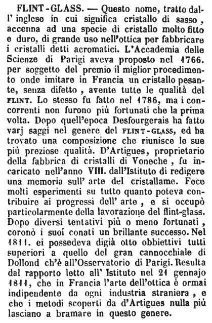 | Flint - Glass - Questo nome, tratto dall'inglese in cui significa cristallo di sasso, accenna ad una specie di cristallo molto fitto e duro, di grande uso nell'ottica per fabbricare i cristalli detti acromatici. L'Accademia delle Scienze di Parigi aveva proposto nel 1766. per soggetto del premio il miglior procedimento onde imitare in Francia un cristallo pesante, senza difetto, avente tutte le qualità del flint. Lo stesso fu fatto nel 1786, ma i concorrenti non furono più fortunati che la prima volta. Dopo quell'epoca Desfourgerais ha fatto varj saggi nel genere del flint-glass, ed ha trovato una composizione che riunisce le sue più preziose qualità. D'Artigues, proprietario della fabbrica di cristalli di Voneche, fu incaricato nell'anno VIII. dall'Istituto di redigere una memoria sull'arte del cristallame. Fece molti esperimenti su tutto quanto poteva contribuire ai progressi dell'arte, e si occupò particolarmente della lavorazione del flint-glass. Dopo diversi tentativi più o meno fortunati, coronò i suoi conati un brillante successo. Nel 1811. ei possedeva digià otto obbiettivi tutti superiori a quello del gran cannocchiale di Dollond ch'è all'Osservatorio di Parigi. Resulta dal rapporto letto all'Istituto nel 21 gennajo 1811, che in Francia l'arte dell'ottica è ormai indipendente da ogni industria straniera, e che i metodi scoperti da d'Artigues nulla più lasciano a bramare in questo genere. [immagine] |