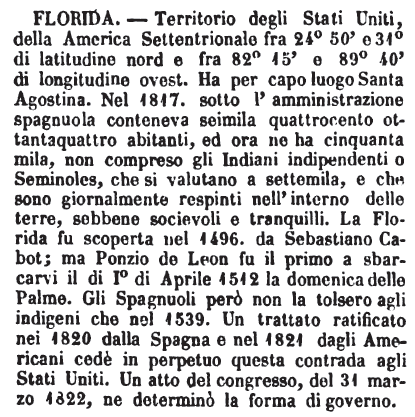 | Florida - Territorio degli Stati Uniti, della America Settentrionale fra 24° 50' e 31° di latitudine nord e fra 82° 15' e 89° 40' di longitudine ovest. Ha per capo luogo Santa Agostina. Nel 1817. sotto l'amministrazione spagnuola conteneva seimila quattrocento ottantaquattro abitanti, ed ora ne ha cinquanta mila, non compreso gli Indiani indipendenti o Seminoles, che si valutano a settemila, e che sono giornalmente respinti nell'interno delle terre, sebbene socievoli e tranquilli. La Florida fu scoperta nel 1496. da Sebastiano Cabot; ma Ponzio de Leon fu il primo a sbarcarvi il dì I° di Aprile 1512 la domenica delle Palme. Gli Spagnuoli però non la tolsero agli indigeni che nel 1539. Un trattato ratificato nei 1820 dalla Spagna e nel 1821 dagli Americani cedè in perpetuo questa contrada agli Stati Uniti. Un atto del congresso, del 31 marzo 1822, ne determinò la forma di governo. [immagine] |