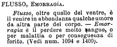 | Flusso, Emorragia - Flusso, oltre quello del ventre, è il venire in abbondanza qualche umore da altra parte del corpo. - Emorragia è il perdere molto sangue, o per malattia o per conseguenza di ferite. (Vedi num.1094 e 1400). [immagine] |