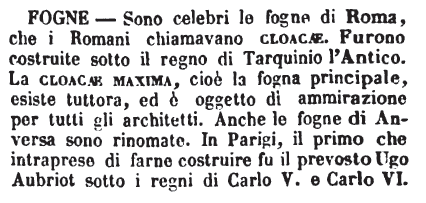 | Fogne o Cloache - Roma avendo nel suo recinto diverse Colline, le acque delle pioggie e delle fontane, dopo d'avere inondato le strade e le piazze situate alle falde di quei Colli, vi formavano degli ammassi di fango e d'altre immondezze, da cui uscivano esalazioni, che infettavano l'aria, e producevano frequentissime malattie. Tarquinio Prisco immaginò il progetto di liberar la Città di tale inconveniente, e renderla così più salubre. A quest'effetto fece costruire certe volte o mine sotterranee così salde che a tempo di Plinio, vale a dire dopo più di 650. anni, non si vedevano quasi punto danneggiate.