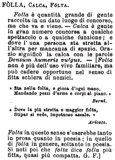 | Folla, Calca, Folta - Folla è quantità grande di gente raccolta in un dato luogo di concorso, ma che va e viene. - Calca è gente in gran numero concorsa a qualche spettacolo o a qualche funzione; e dove l'una persona sta stretta all'altra per mancanza di spazio. Orazio significò la calca con le parole Densum Humeris vulgus. - [Folta non è più dell'uso vivo familiare, ma può cadere opportuno nel senso di fitta schiera di nemici.