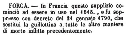 | Forca - In Francia questo supplizio cominciò ad essere in uso nel 1515, e fu soppresso con decreto del 21 gennajo 1790, che sostituì la guillottina a tutte le altre maniere di morte inflitte precedentemente. [immagine] |