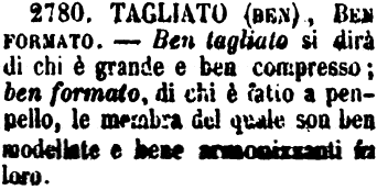 | Tagliato (ben), Ben formato - Ben tagliato si dirà di chi è grande e ben compresso; ben formato, di chi è fatto a pennello, le membra del quale son ben modellate e bene armonizzanti fra loro. [immagine] |