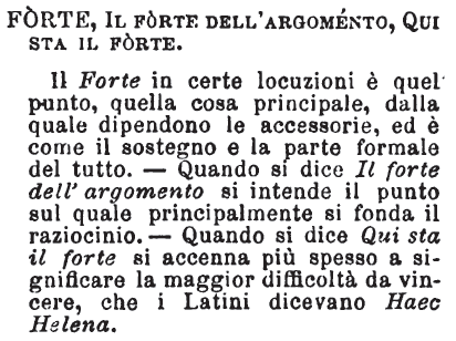 | Forte, Il forte dell’argomento, Qui sta il forte - Il Forte in certe locuzioni è quel punto, quella cosa principale, dalla quale dipendono le accessorie, ed è come il sostegno e la parte formale del tutto. - Quando si dice Il forte dell'argomento si intende il punto sul quale principalmente si fonda il raziocinio. - Quando si dice Qui sta il forte si accenna più spesso a significare la maggior difficoltà da vincere, che i Latini dicevano Haec Helena. [immagine] |