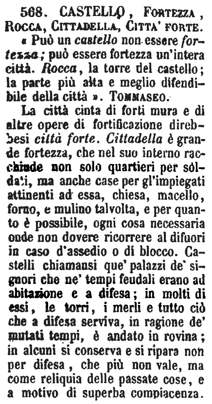 Castello, Fortezza, Rocca, Cittadella, Città forte - «Può un castello non essere fortezza; può essere fortezza un'intera città. Rocca, la torre del castello; la parte più alta e meglio difendibile della città.» Tommaseo.