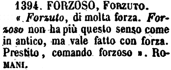 | Forzoso, Forzuto - «Forzuto, di molta forza. Forzoso non ha più questo senso come in antico, ma vale fatto con forza. Prestito, comando forzoso». Romani. [immagine] |
