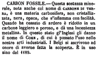 | Carbon Fossile - Questa sostanza minerale, nota anche col nome di carbone di terra, è una materia carbonifera, non cristallizzata, nera, opaca, che s'infiamma con facilità. Quando ha cessato di ardere è ridotto in un carbone leggiero e poroso, e dà una lucentezza metallina. In questo stato gl'Inglesi gli danno il nome di Coke, di cui è passato l'uso nelle nostre arti industriali. I Belgi si ascrivono ad onore di averne fatta la scoperta. E' in uso sino dal 1189. [immagine] |