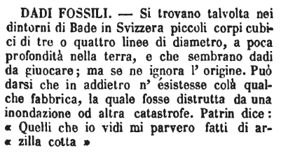 | Dadi fossili - Si trovano talvolta nei dintorni di Bade in Svizzera piccoli corpi cubici di tre o quattro linee di diametro, a poca profondità nella terra, e che sembrano dadi da giuocare; ma se ne ignora l'origine. Può darsi che in addietro n'esistesse colà qualche fabbrica, la quale fosse distrutta da una inondazione od altra catastrofe. Patrin dice: « Quelli che io vidi mi parvero fatti di arzilla cotta » [immagine] |