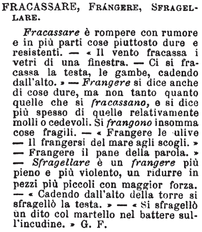 | Fracassare, Frangere, Sfragellare - Fracassare è rompere con rumore e in più parti cose piuttosto dure e resistenti. - «Il vento fracassa i vetri di una finestra. - Ci si fracassa la testa, le gambe, cadendo dall'alto.» - Frangere si dice anche di cose dure, ma non tanto quanto quelle che si fracassano, e si dice più spesso di quelle relativamente molli o cedevoli. Si frangono insomma cose fragili. - «Frangere le ulive - Il frangersi del mare agli scogli.» - «Frangere il pane della parola» - Sfragellare è un frangere più pieno e più violento, un ridurre in pezzi più piccoli con maggior forza. - «Cadendo dall'alto della torre si sfragellò la testa.» - «Si sfragellò un dito col martello nel battere sull'incudine.» G. F. [immagine] |