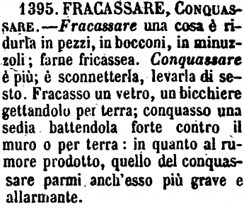 | Fracassare, Conquassare - Fracassare una cosa è ridurla in pezzi, in bocconi, in minuzzoli; farne fricassea. Conquassare è più; è sconnetterla, levarla di sesto. Fracasso un vetro, un bicchiere gettandolo per terra; conquasso una sedia battendola forte contro il muro o per terra: in quanto al rumore prodotto, quello del conquassare parmi anch'esso più grave e allarmante. [immagine] |
