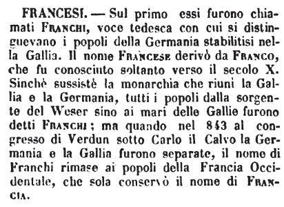 | Francesi - Sul primo essi furono chiamati Franchi, voce tedesca con cui si distinguevano i popoli della Germania stabilitisi nella Gallia. Il nome Francese derivò da Franco, che fu conosciuto soltanto verso il secolo X. Sinché sussisté la monarchia che riunì la Gallia e la Germania, tutti i popoli dalla sorgente del Weser sino ai mari delle Gallie furono detti Franchi; ma quando nel 843 al congresso di Verdun sotto Carlo il Calvo la Germania e la Gallia furono separate, il nome di Franchi rimase ai popoli della Francia Occidentale, che sola conservò il nome di Francia. [immagine] |