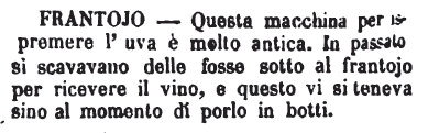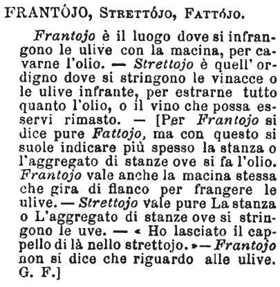 | Frantojo, Strettojo, Fattojo - Frantojo è il luogo dove si infrangono le ulive con la macina, per cavarne l'olio. - Strettojo è quell'ordigno dove si stringono le vinacce o le ulive infrante, per estrarne tutto quanto l'olio, o il vino che possa esservi rimasto. - [Per Frantojo si dice pure Fattojo, ma con questo si suole indicare più spesso la stanza o l'aggregato di stanze ove si fa l'olio. Frantojo vale anche la macina stessa che gira di fianco per frangere le ulive. - Strettojo vale pure La stanza o L'aggregato di stanze ove si stringono le uve. - «Ho lasciato il cappello di là nello strettojo.» - Frantojo non si dice che riguardo alle ulive. G. F.] [immagine] |