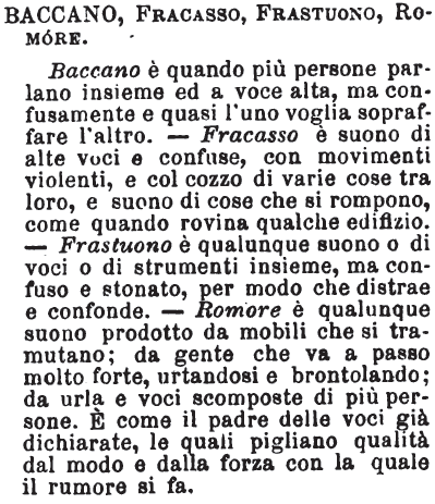 Baccano, Rumore, Strepito, Rombo, Ronzio, Rombazzo, Frastuono, Fracasso, Chiasso, Schiamazzo, Schiamazzio, Scroscio - «Baccano, rumore non piccolo di gente che scherza e che ruzza, o come che sia si trastulla. Rumore di contesa o di lavorio, baccano non è; onde questo ha senso talvolta di sozzi diporti. Rumore è più generico: dicesi e di persone e di cose. Strepito è più di rumore. Fracasso è rumore di cose che si rompano o siano rotte, o simile al rumore di una o più cose che si rompano. Frastuono è rumore che fanno diversi suoni insieme confusi. Schiamazzo, gran rumore di grida discordanti e disordinate». Romani.