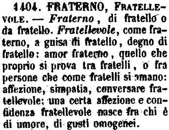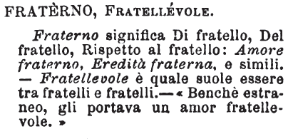 | Fraterno, Fratellevole - Fraterno, di fratello o da fratello. Fratellevole, come fraterno, a guisa di fratello, degno di fratello: amor fraterno, quello che proprio si prova tra fratelli, o fra persone che come fratelli si amano: affezione, simpatia, conversare fratellevole: una certa affezione e confidenza fratellevole nasce fra chi è di umore, di gusti omogenei. [immagine] |