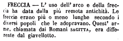 | Freccia - L'uso dell'arco e della freccia ha data dalla più remota antichità. Le freccie erano più o meno lunghe secondo i diversi popoli che le adopravano. Quest'arme, chiamata dai Romani sagitta, era differente dal giavellotto. [immagine] |