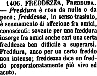 | Freddezza, Freddura - Freddura è cosa da nulla o da poco; freddezza, in senso traslato, è scemamento di affezione fra amici, conoscenti: sovente per una freddura insorge fra amici anche cari una certa freddezza ben difficile a superarsi. Freddura, anco per un certo freddo non intenso; freddezza dice un freddo proporzionatamente più vivo ed acuto. [immagine] |
