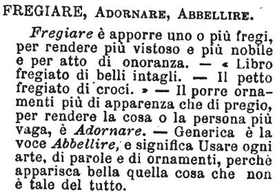 | Fregiare, Adornare, Abbellire - Fregiare è apporre uno o più fregi, per rendere più vistoso e più nobile e per atto di onoranza. - «Libro fregiato di belli intagli. - Il petto fregiato di croci.» - Il porre ornamenti più di apparenza che di pregio, per rendere la cosa o la persona più vaga, è Adornare. - Generica è la voce Abbellire, e significa Usare ogni arte, di parole e di ornamenti, perchè apparisca bella quella cosa che non è tale del tutto. [immagine] |